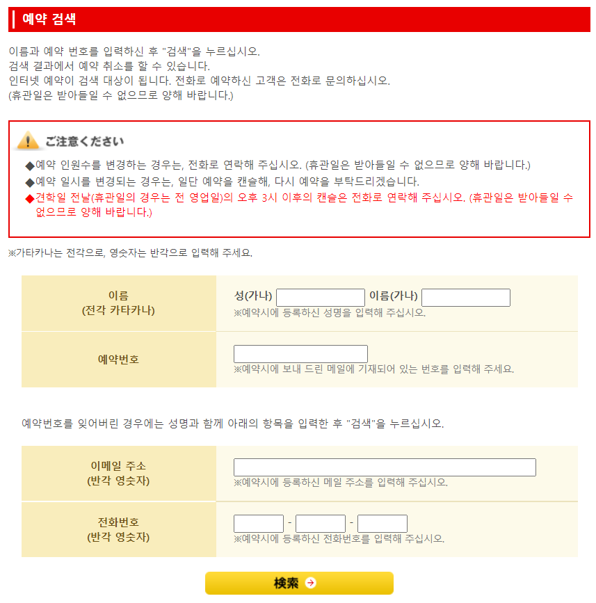 그리고 아까 입력하신 이름, 이메일 주소, 전화번호와 메일에 기재되어 있는 예약번호를 입력하시고 노란색 버튼을 누릅니다.