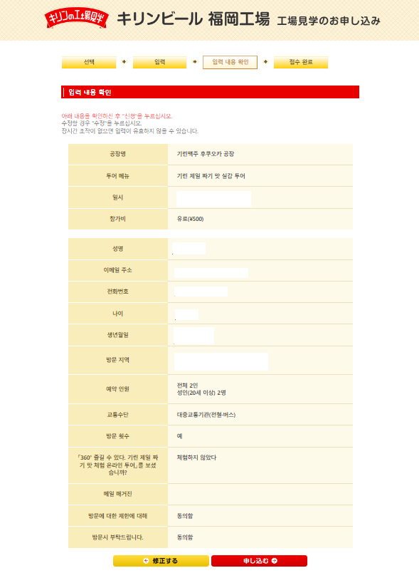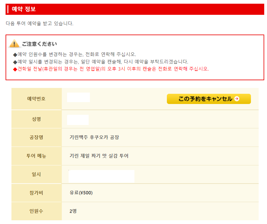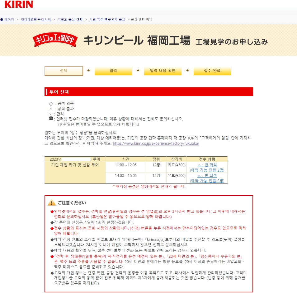 투어 예약은 간단하지만 하루에 투어 가능한 시간 대가 2가지뿐이고 참여할 수 있는 정원도 각각 12명뿐이라 후쿠오카 기린 맥주 공장에 견학을 하실 분들이라면 미리 예약을 하시는 것을 추천드립니다.