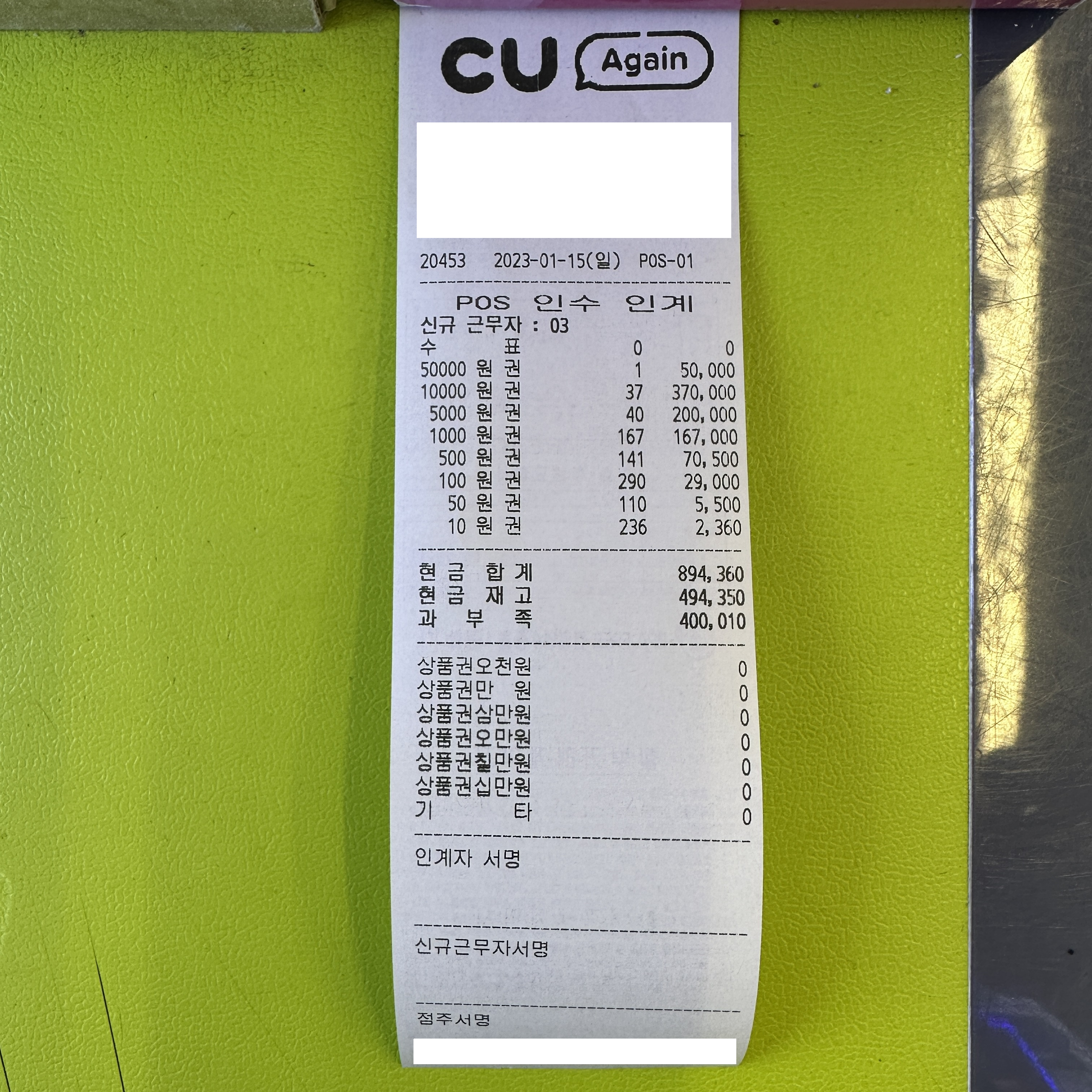 인수인계란 출근 후 전 파트의 근무자와 교대할 때와 퇴근 전 다음 파트의 근무자와 교대할 때 포스기의 현금 시재가 일치하는지 확인하는 일입니다.