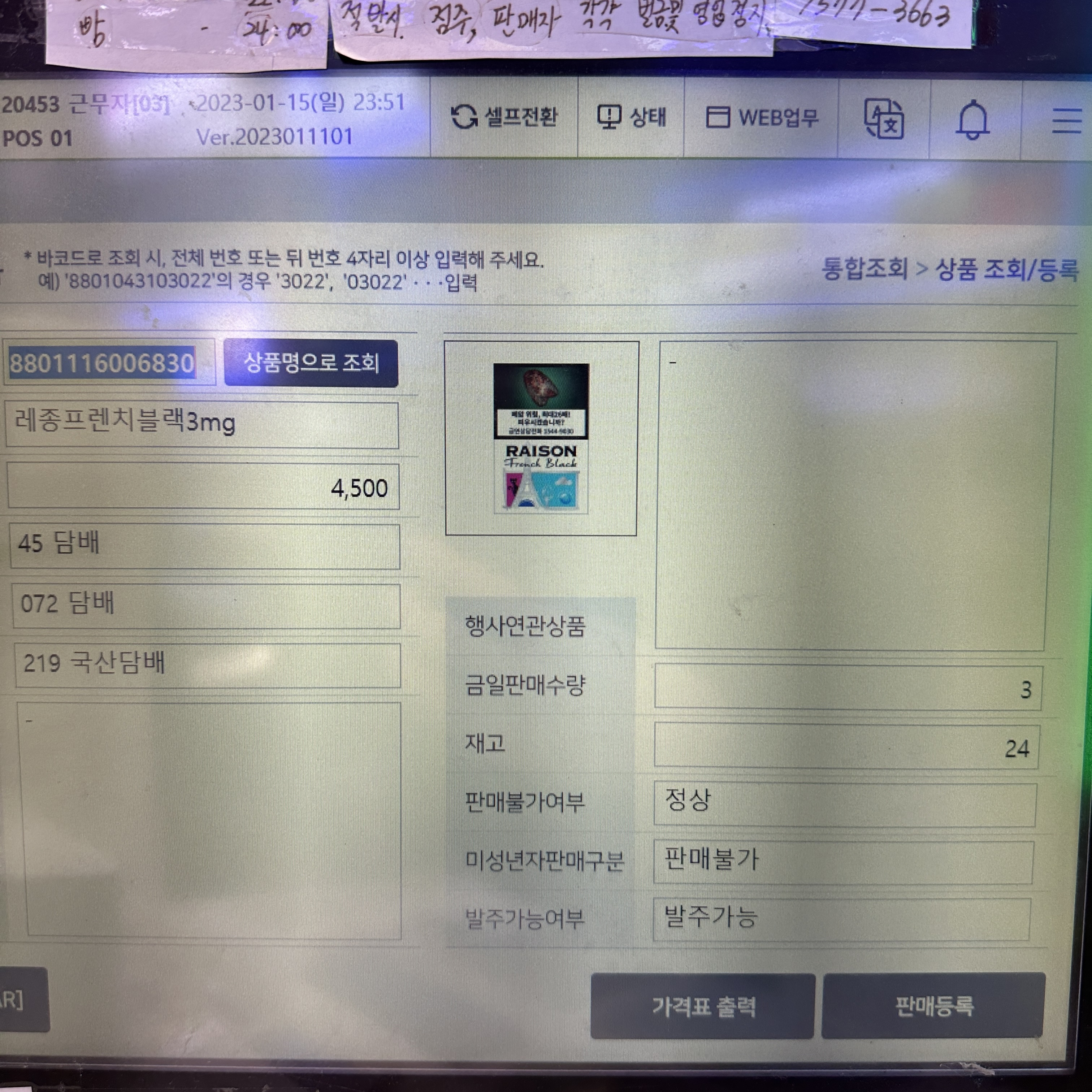 예를 들어 '레종 프렌치 블랙'이라는 담배의 재고를 확인해 보겠습니다.