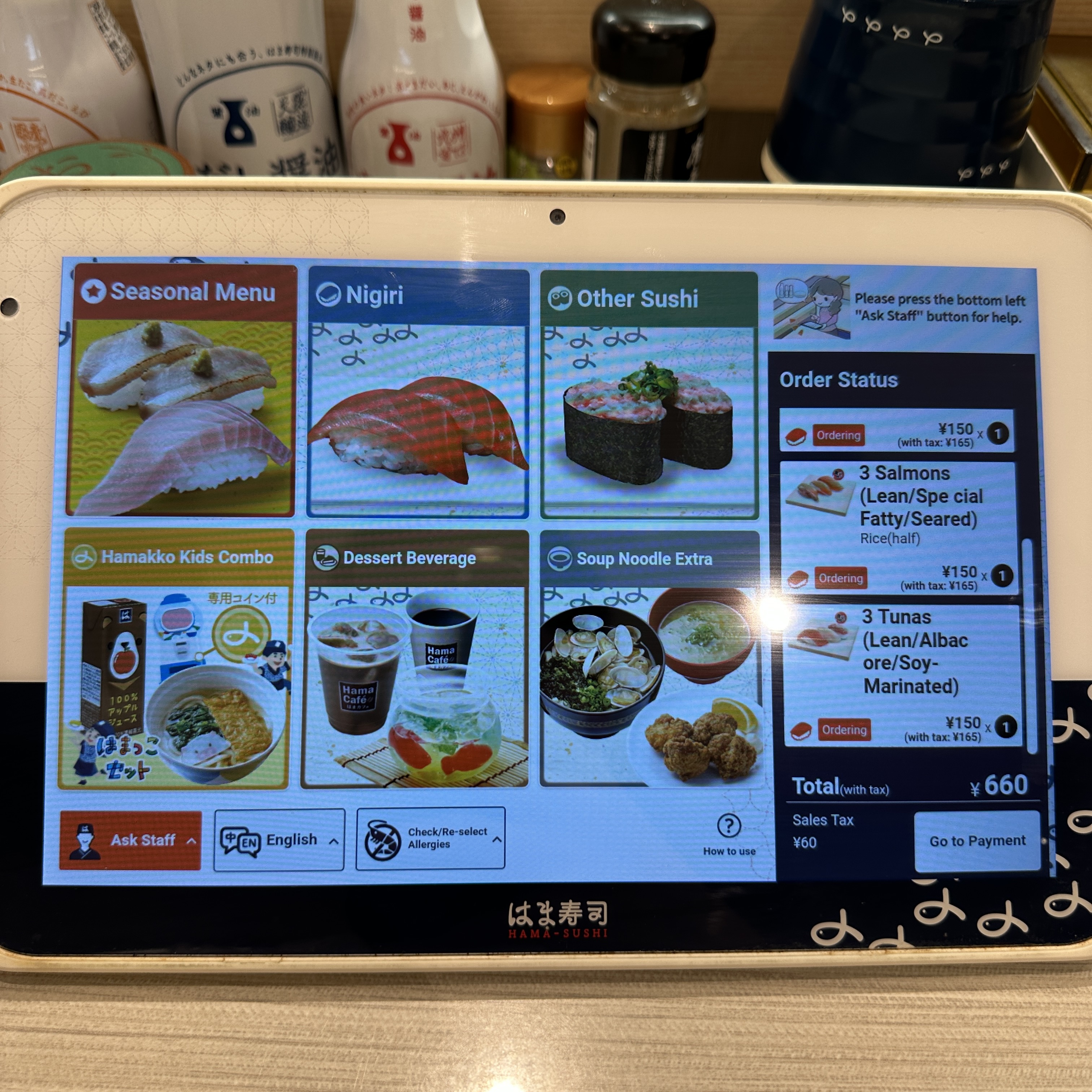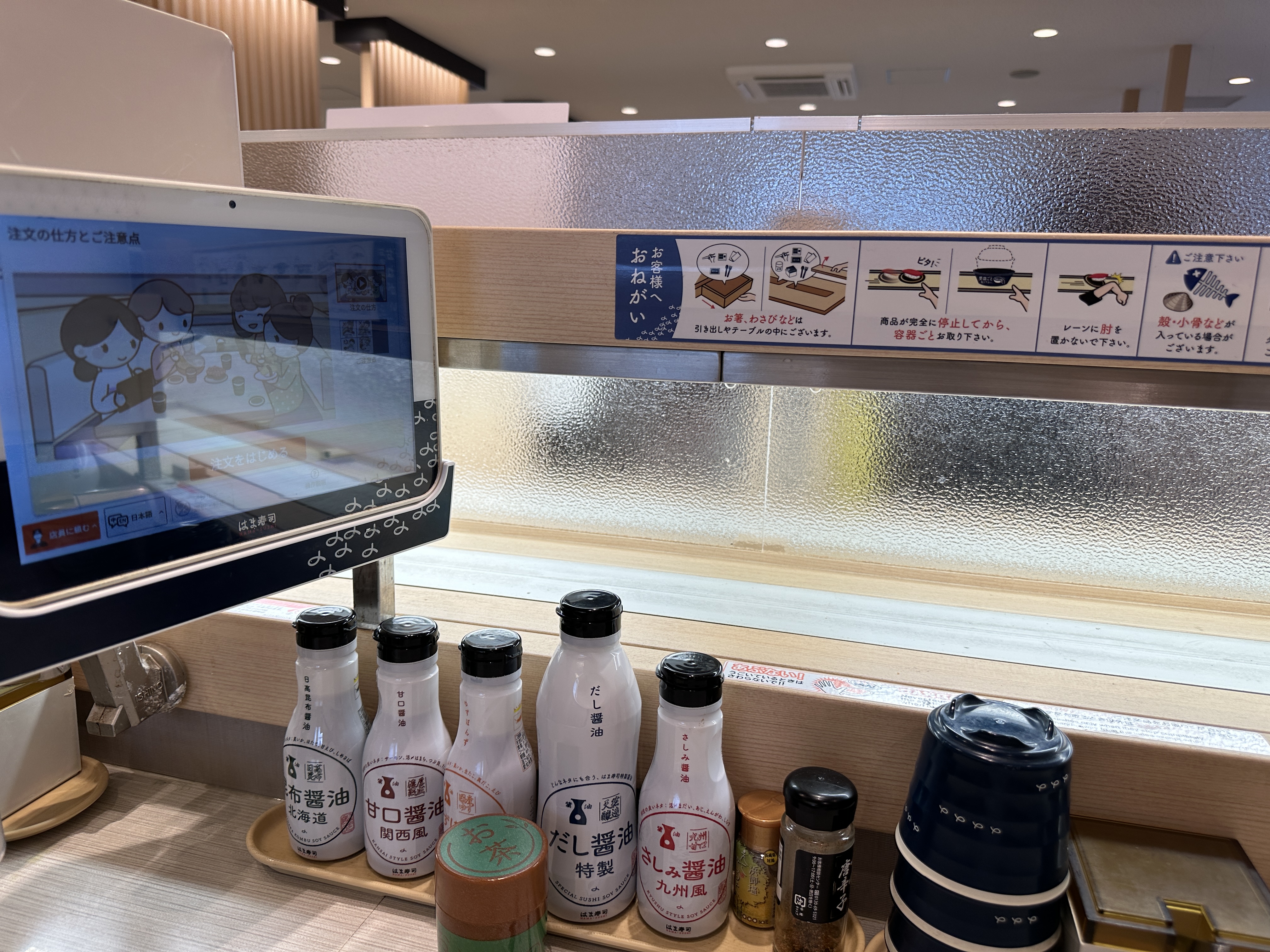 사진 좌측의 스크린으로 주문을 하면 자리 앞으로 주문한 음식이 도착하는 시스템이다!