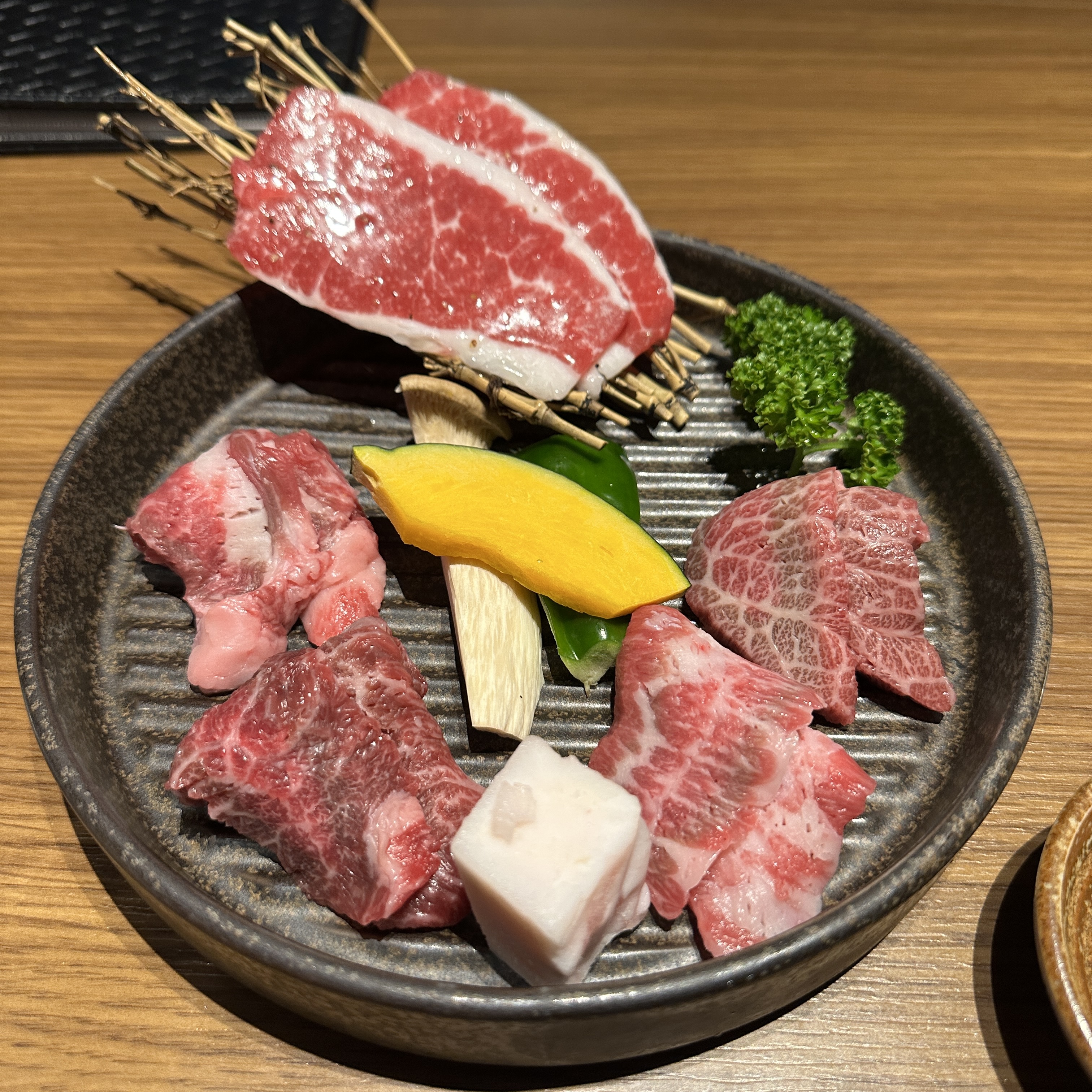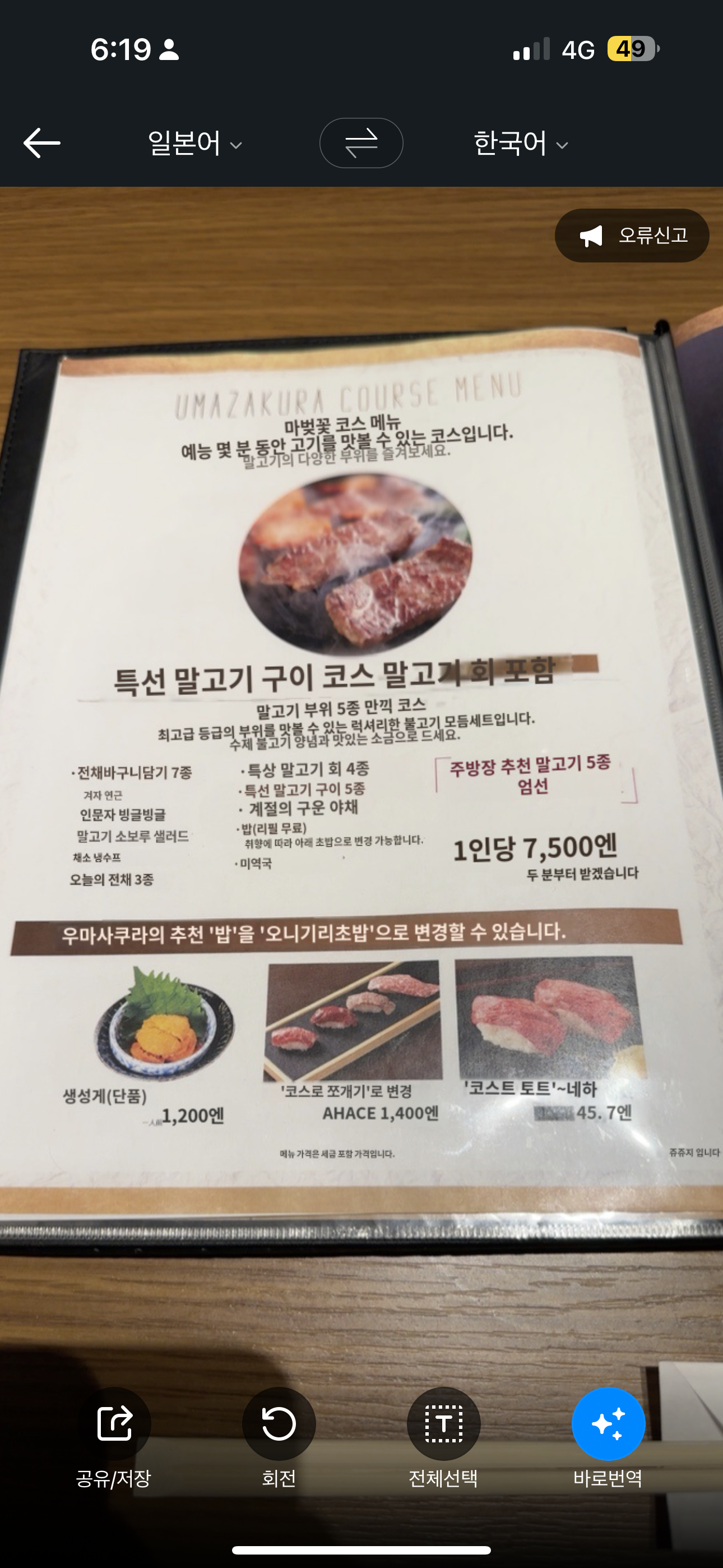 나는 1인당 7500엔짜리 메뉴인 특선 말고기 구이 코스를 주문했다.