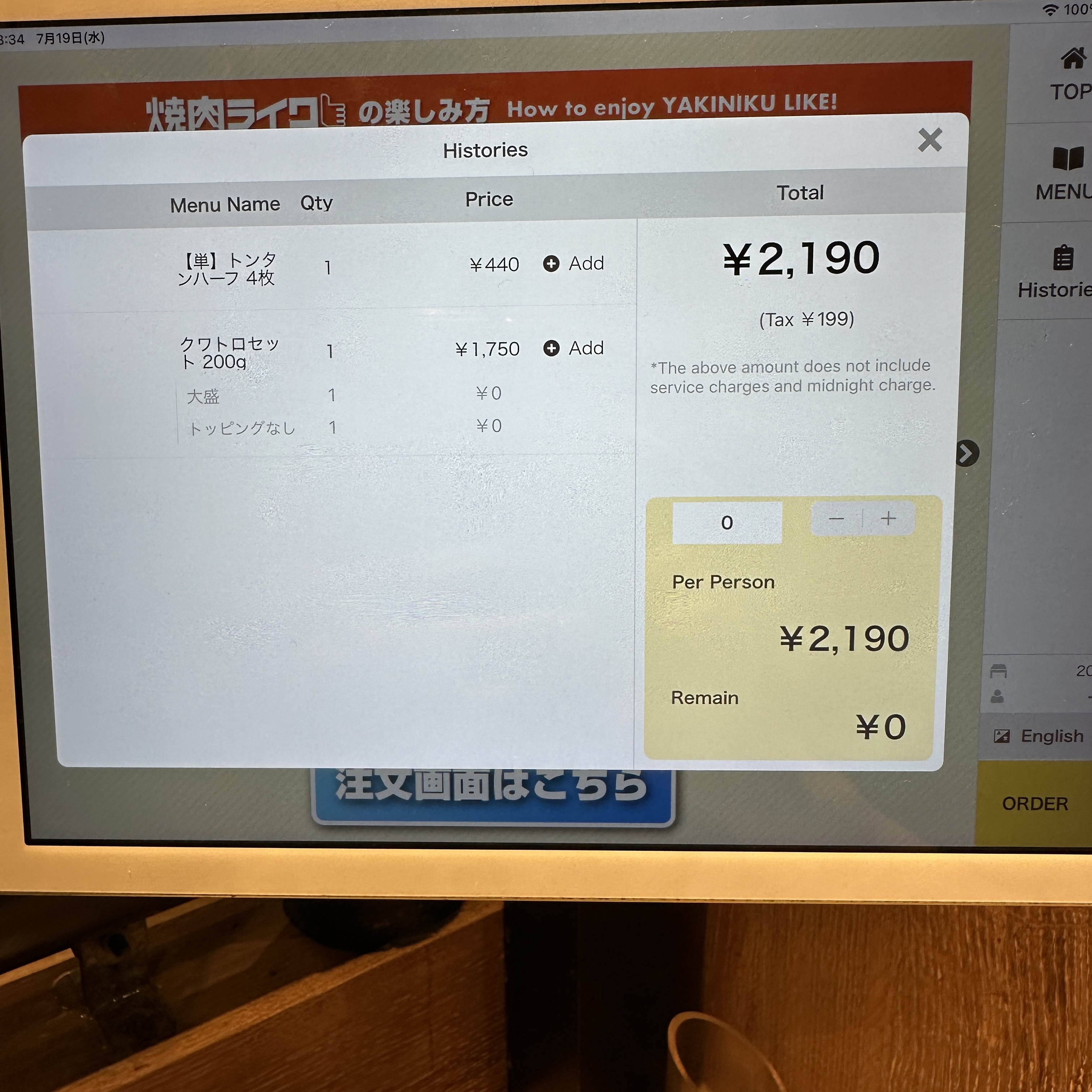 나는 3대 인기 야키니쿠 세트 중 Like Quatro Set 우설 200g 버전을 주문했다. (1750엔짜리)
