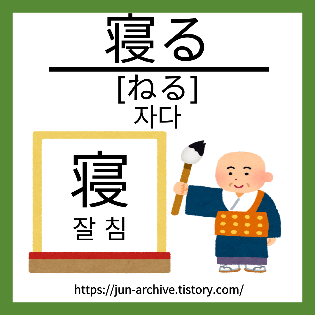 「寝る」의 「寝」은 “잘 침”이라는 한자이고, “자다”라는 의미의 일본어 단어입니다.